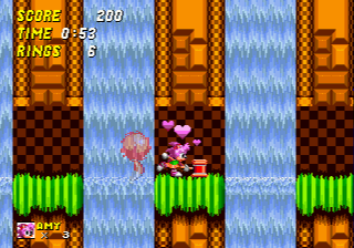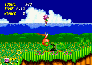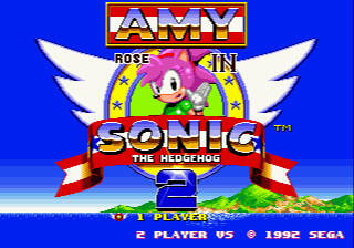This is a hack which makes Amy Rose the primary character in Sonic the Hedgehog 2 for Genesis. It is classic Amy designed after her Sonic CD appearence.Amy’s moves are inspired by those used in her Sonic Advance appearance. She is slower than Sonic, can’t use spin attack but has other moves. An attack button has been added and other moves can also be performed by using combinations of buttons and directional pad presses. A complete move list is found in the readme.This has been tested on a 1.0 version ROM in BIN format. It has not been tested for compatibility on other formats or other revisions. The patch is in xdelta format due to shifted data resulting in a ips patch larger than the ROM itself.Revision 1.6Certain physic tweaks as with the S1 hack to be more authentic to Advance 1.Amy can now use Giant Steps (upward dash is now activated with Up and B/C).Amy can hammer switches and egg prisons.Hammer hearts now trailing objects as in S1.Select tracks, 03, 03, 03, 0B, 10, 10, 10 and 04 on the level select sound test to play a secret gameplay mode.Continue screen freeze bug fixed.