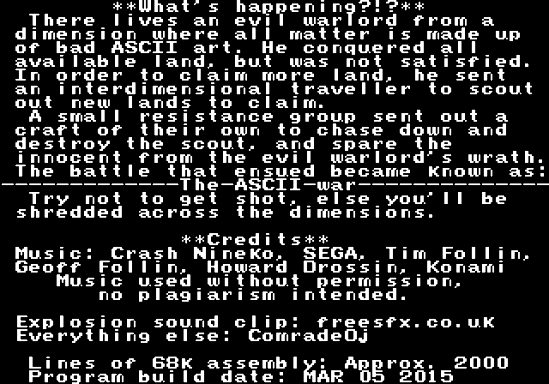ASCII WAR - A simple 2 player homebrew Genesis game A month or so ago I decided to start working on a simple 2 player combat game. Now it's pretty much finished. It could still use some polish though! I decided to just have fun with it, and get kind of creative. What's the point in making a Genesis game if you can't have fun while you're doing it? The plot: An evil warlord lives in a dimension where everything is made up of ASCII art. He sent out a scout, to look for new lands to conquer. A resistance group also sent out a scout of their own, and they meet in out dimension to fight. The ships don't shoot bullets, but strings of text. It's dumb, but I thought it was just goofy enough to work. The concept almost reminds me of the Mooninites from ATHF. About the game: The music is all from miscellaneous sources. It's all played back using my simple VGM driver. The background graphics are all various photos I had taken in the past, and the images of my desk and cat were taken specifically for the game. The digitized still image backgrounds look pretty ugly, so I might try experimenting with using 2 backgrounds layers, that way I can get twice the colors. The game was programmed in 68k assembly, and consists of about 2000 lines of code. I have not idea if this game is fun or not. I sure had fun making it though. I'm afraid that gameplay will just devolve into flying as fast as you can while spamming the fire button. It could easily be polished up, and re-skinned into a different game in the future though. I bet this game could be transformed into a fun 2 player top down naval combat game with torpedoes, mines, and map obstacles. As it is, it plays kind of like a 2 player VS. game of asteroids. If someone is able to get a friend to play this with them, I would love to know how it worked out. I wasn't able to find someone to play it with me, so I haven't really "played" this game. I'm open to critique. Controls: The D pad moves you around, and the 'A' button shoots. 'B' locks your movement vertically, and 'C' locks your movement horizontally. I'm hoping that the axis locking will add a little bit of depth to the combat. ROM Download link: https://drive.google.com/file/d/0B-uZnRwZEI1YYkNJWkJEbHEtSmM/view?usp=sharing Source code is included with the ROM download. Seasoned programmers will cringe when they open up those .ASMs, but I still like to include source code for everything I make, even if it shows a lot of improper coding that would otherwise be unknown to everyone. Gameplay video: I was playing both side by myself, so that's why there is so much aimless wandering around the screen and missed shots. https://youtu.be/_bWWyrh1O0c