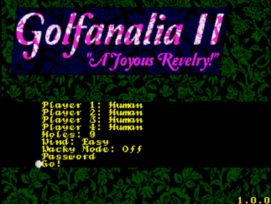 When the gods celebrate a round of golf, they do it differently than mortals. No ageless deity would content themselves with yet another 18 holes at St. Andrews or Pebble Beach, teeing off for the same shot that they have made literally thousands of times already. When you're a divinity, you BYOGC (Build Your Own Golf Course).Let's experience the golf of gods! You and up to 3 friends collaborate on building your own course, and then vex each other as you try to get the ball into the hole. The rules are a little different, but any aspiring immortal will catch on quickly.How to PlayBuilding PhasePlayers simultaneously drop their tiles onto the board. Each tile is divided into 4 sides, and each side will be made of one of the four elements: Fairway Rough Sand TreeIn order to place a tile:The tile must be adjacent to at least one other tile (up, down, left, or right)The elements on each side of the tile must match the elements on adjacent tiles.If you complete an entire feature (e.g. complete all sides of a tree or a sand trap) then you will win the territory and your number will be painted on it.If you hold a tile for too long, it will be replaced by a different tile.Press A or C to rotate your tile. Press B to place it.Golfing PhaseWhen it's your turn to golf, use the left and right buttons to aim, the up and down buttons to change your club, and A, B, or C to confirm. After confirming your club and angle, you will press A, B, or C to set your power and accuracy.All players take turns hitting the same ball.If you get super frustrated, you can give up on a hole by pressing Start and then A+B+C at the same time.Scoring:If you hit the ball into your territory, you get one point.If you hit the ball into your opponent's territory, your opponent gains one point.If you hit the ball closer to the hole than it has been before, you get a point.If you hit the ball into the hole, you get two points.While you're not golfing, you can honk a horn (button C) or fire a rocket (button B). Try not to be too obnoxious.The person with the most points after 9 holes wins.Technical:This is a Sega Genesis/Mega Drive rom. It supports 4-player using the EA "4 Way Play" protocol (also available using the Team Player version 2). It should work on real hardware using a flash cart or in emulation. I recommend Genesis Plus GX.Asset sources are available in the "attribution.md" file.