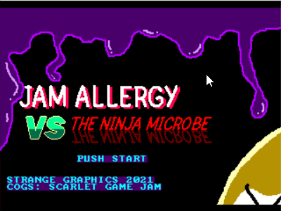 itch comments : You're ALLERGIC TO JAM!! Dodge it to win!!Dodge one hundred evil jams to win the game!, Works on a realĀ hardware! (hopefully) LOL, Try it yourself on an emulator OR uploading it to this online emulator:, https://www.emulatrix.com/, , NOTE: the music is a bit loud, be prepared for some blast processing!, , This was coded entirely in Second Basic Studio for the Rutgers COGS Scarlet game jam!,