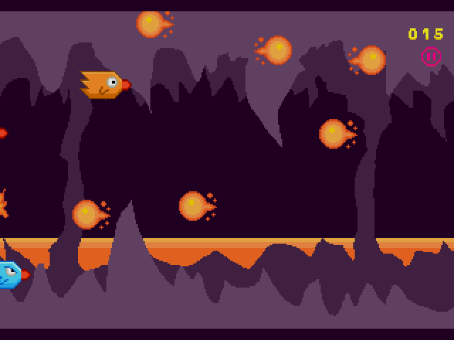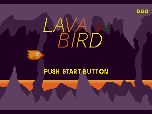 itch comments : this is a sega genesis/mega drive demake of the 2014 game "Lava Bird" by Unept. this is a flappy bird-style game where you flap and shoot fireballs to defeat the pursuing enemy birds, but beware: your fireballs bounce back toward you! , avoid the enemy birds, your own fireballs, and don't fall or hit the ceiling, otherwise it's game over!, controls:, A, B or C buttons to flap and shoot fireball, START to pause game. a pink icon is shown when the game is paused