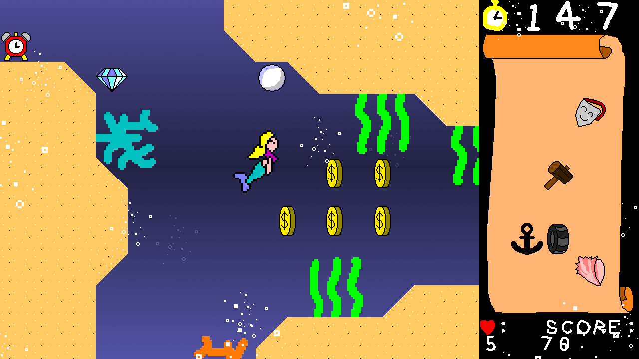 itch comments : at the moment this is a tech demo..., Lily likes to spend her mermaid days picking up the neat treasures she finds from the surface. can you help lily gather all her stuff before the time runs out., play as either lily or her friends as they venture into sunken ships, ancient temples and volcanic undersea beds in this fun race against the clock game., HOW TO PLAY, 5 to insert coins, 1 to start game, up down left right to move about in a direction