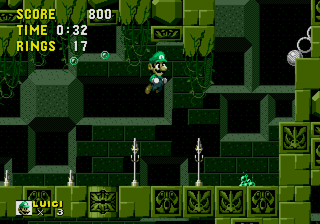 Luigi took a wrong warp and landed straight into Sonic 1!Moves:Green Missile: Up + B (couldn’t add RNG to it)High Jump: AGround Pound: Down + BSwim: A/B/C Underwater (duh)Faster Swim/Exit water: Up + A/B/C UnderwaterThere’s a bug where you can clip through springs by holding Down. Shouldn’t affect gameplay too much. Also, if you ever have trouble beating a level, sit still for a while, you might beat the level as if it was absolutely nothing.Rev01, fixed a few issues:Ground Pound is now Down + BFixed Luigi’s diagonal walk and ending spritesLuigi can now actually beat the full game by doing absolutely nothingCan no longer ground pound or green missile underwater