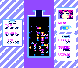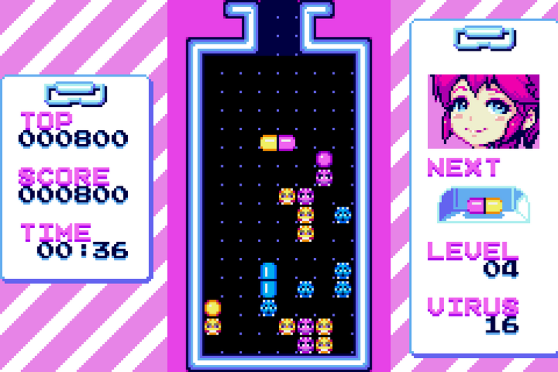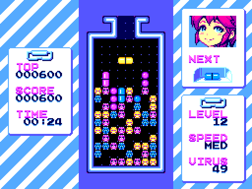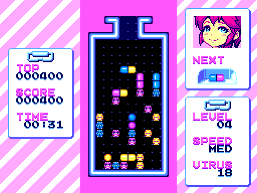 Help Mai get rid of viruses with pills, line up 4 slots of the same color horizontally or vertically to destroy them and progress through the levels in this classic puzzle game! Code, sound driver, music and art by myself, made with GBDK2020 MS/GG/GB.I may consider making physical releases, please don't hesitate to say what you think in comment :)4 new platforms added including SNes, GBA, Nes & MD!!