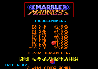 This patch is designed to add a simple saving mechanism for High Scores in Marble Madness.How to use:Saving:Scores save after Initials are entered and player leaves the High rollers Screen. Loading:Scores load upon boot. If checksum fails or it is your first time booting, default scores are loaded.Patching details can be found in the readme.