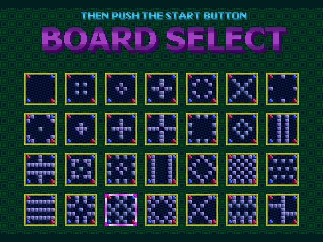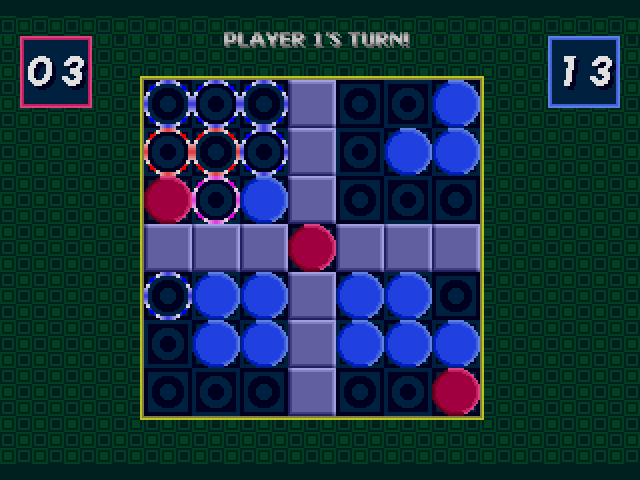 itch comments : this is a 2 player strategic board game for the sega mega drive/genesis that plays on a 7x7 grid. there are two piece colors, red (player 1) and blue (player 2). at the starts of a new game, red always starts first. pieces can be cloned (1 step) or jumped (2 step). after a turn, the opponent's pieces adjacent to the moving player are changed to a new color (e.g. red turns blue, blue turns red)., the game ends when the board is full, one player has no pieces left, or one player had ran out of possible moves., controls (for both human players, sadly there's no cpu controlled opponent):, d-pad to move cursor., A button to select the corresponding piece., B button to make a move in highlighted area., C button to deselect the selected piece., START to pause, while paused you can press A to exit the ongoing game.