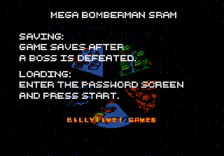 This patch is designed to add a simple saving mechanism to the single player portion of Mega Bomberman.Details and Patching Instructions can be found in the Readme.