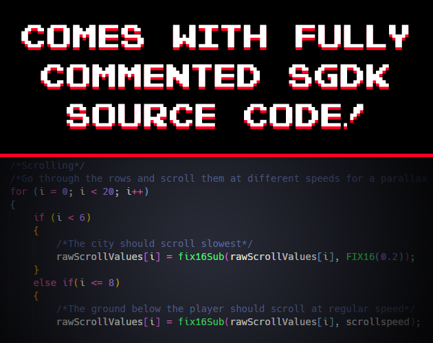 itch comments : Megarunner is an endless runner for the Sega Mega Drive/Genesis! It was coded in C using the Sega Genesis Development Kit (SGDK). This game comes with the fully commented source code., , —, , NOTE: This project will not work with the latest version of SGDK (1.80), only with 1.70. That's why it's now FREE!, —, , Jump over and slide under missiles to keep running for as long as you can and rack up a high score! And once you're done, crack open the source and learn how to code a Mega Drive game yourself!, The code will show you how to:, Handle game statesImplement tile-scrolling for a parallax effectUse structs for entitiesImplement sound effects, And more!, You'll also find a collection of FREE tutorials on Mega Drive coding on my website, including a step-by-step guide on creating a basic version of Megarunner., I hope you enjoy the game and if you end up using the code to create something cool, make sure to let me know!, Also, check out my Megapong project!