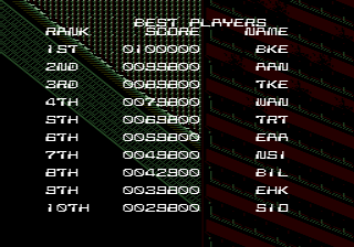 This patch is designed to add a simple saving mechanism for High Scores in Midnight Resistance.How to use:Saving:Scores save after Initials are entered and player returns to the title screen. Loading:Scores load upon boot. If checksum fails or it is your first time booting, default scores are loaded.