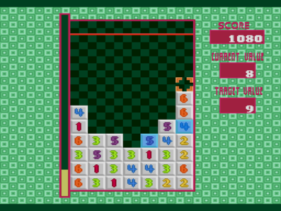 a number based puzzle game for the sega mega drive/genesis where you destroy blocks by matching the target value. a new row of blocks spawns from the bottom every time you make a move or your timer runs out. don't let them reach to the top or its game over! and importantly, the target value must be equal to the current value!
