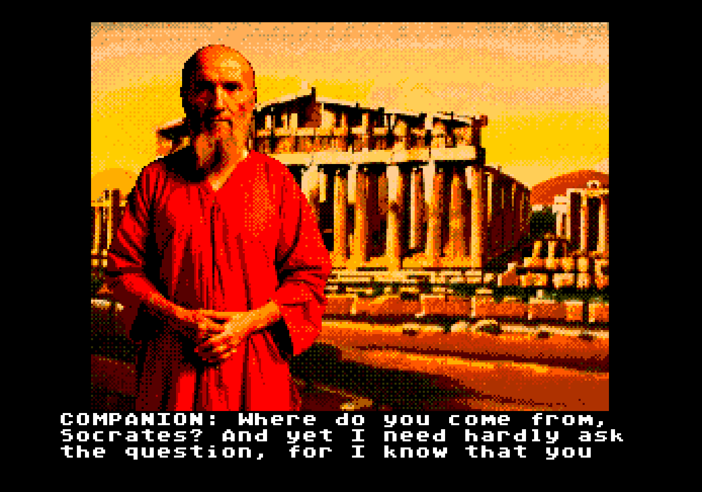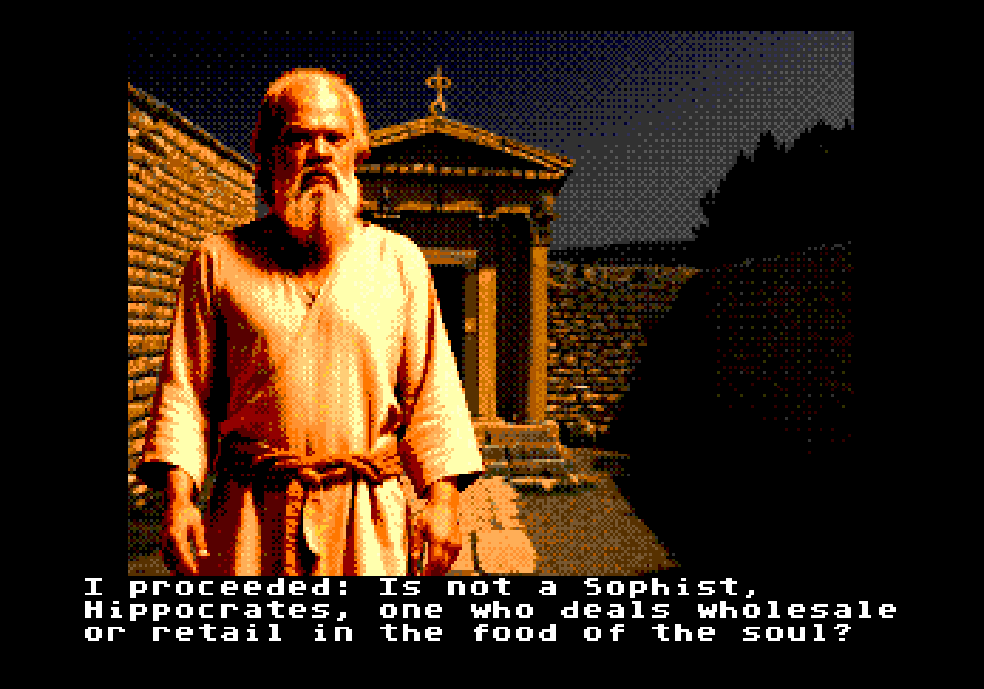 itch comments : Plato’s Protagoras converted to a Kinetic Visual Novel for the Sega Mega Drive., , Full credit for all the text goes to Project Gutenberg., , The actual e-book that was used for the creation of this VN can be found at: Plato’s Protagoras., , Tools used VNMD, SGDK, Aseprite , and Graphics were A.I. generated with Stable Diffusion., , This “game” was made for the Sega Mega Drive aka Sega Genesis, but can be run on any emulator. , , NOTE , I realized that I had the ages of several characters wrong. For example, Socrates in this Work is probably around 34. Callias 16 or 21 and so on. When I was doing this, I thought that the work was placed between 424 and 420 BC, but as it looks like it is around 434 BC. , Also, Socrates was older from the beginning, because I thought that it will be better to have an image of him that it is more recognizable, but now I think this was wrong., I may update the images in the future.