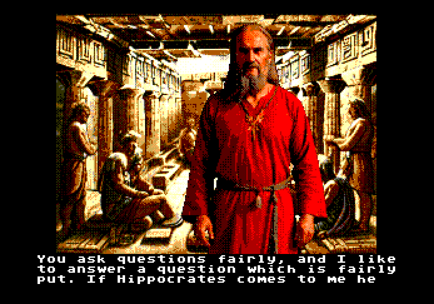 Plato’s Protagoras converted to a Kinetic Visual Novel for the Sega Mega Drive. Full credit for all the text goes to Project Gutenberg. The actual e-book that was used for the creation of this VN can be found at: Plato’s Protagoras. Tools used VNMD, SGDK, Aseprite and Graphics were A.I. generated with Stable Diffusion. This “game” was made for the Sega Mega Drive aka Sega Genesis, but can be run on any emulator. NOTE I realized that I had the ages of several characters wrong. For example, Socrates in this Work is probably around 34. Callias 16 or 21 and so on. When I was doing this, I thought that the work was placed between 424 and 420 BC, but as it looks like it is around 434 BC. Also, Socrates was older from the beginning, because I thought that it will be better to have an image of him that it is more recognizable, but now I think this was wrong.I may update the images in the future.