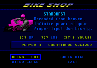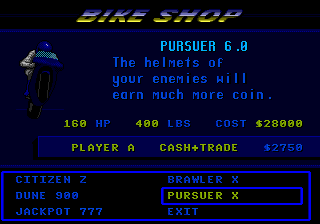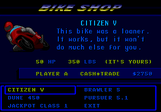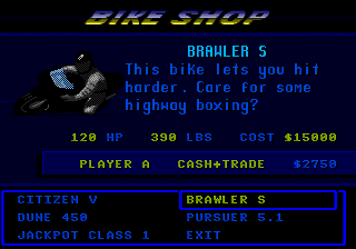 Road Rash II – Nitro CircusNov 11th 2025BillyTime! Games——————–This is patch is an overhaul to Road Rash II on Sega Genesis. Includes frame rate Improvement and mode 1 music hack by Ti.New Bikes with three levels per class (Ultra Light/Super Bikes/Nitro Bikes)———————————–Six New Bike Classes with perks!(Bike 1 – Citizen) – Normal Bike(Bike 2 – Dune) – Off Road Capability -> Bike Takes Less Damage(Bike 3 – Jackpot) – Extra Money when winning races (250 -> 500 -> 1000)(Bike 4 – Brawler) – Damage Multiplier (Club at start for Lvl 2 and up)(Bike 5 – Pursuer) – Money Earned when Eliminating racers (100 -> 200 -> 500) (Chain at start for Lvl 2 and up)(Bike 6 – Starburst) – All Perks Active! (Replaces Wild Thing 2000)Universal ChangesAdjusted acceleration for all bikesSlightly Nerfed enemy acceleration for higher levelsFaster walk speed when thrown from bikeWild Thing Cheat adds extra $250,000 when performed on the title screen.SRAM——————–Saving:Game saves after completing all five tracks and advancing to the next level.Loading:Enter Game Options, select Load Game, then press start.NOTE:Game will produce a black screen if no prior save is detected.Player 2’s Progress will not be saved