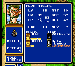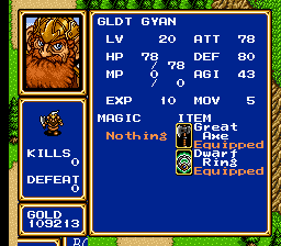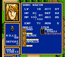 This romhack is designed to make the character choices feel more different from each other, and some class and promotion changes also designed to make choices more interesting. The goal was a hack that “feels like the base game” as much as possible.Here are the most relevant changes:Centaurs all have a little more HP to differentiate from dwarven warrior frontliners and monstersCentaurs are more different from each other too, Rick more DEF, Eric more ATK, Higins has a little healing magic and Jaro already knows some black magic when you get himDwarves (Jaha Randolf Gyan) get a ring that regens 5 HP/turn (you get a pair of these whenever you get Randolf)Warrior promotions are more different from each other–Barons have a chance to slow the opponent on hit (reducing defense) and Gladiators have magic resistKazin and Tyrin keep their signature spell (Blaze and Bolt, respectively) when/if they promote to SORC. Taya is still the “default” SORC. Also, ALL magic spells are more powerful (by about half), but this affects enemy spells too.Gerhalt has a lot less ATK but he has a higher chance of attacking multiple times and higher crit chance (which you should try, it feels great)Elric has more DEF and Janet has more ATK (sharpening their differences). If you promote to Sniper, you have more consistent crit damage, while Brass Gunners are inconsistent but hit harder (sometimes). This doesn’t replace MOV change from base game. Also, late game, some weapons have an extra +1 range for these 3 (or 4 if you count May).Sarah gets a small heal on DETOX, which is nice since she doesn’t have AOE healing otherwise, though its nowhere near as good as AURA. Sheela will (eventually) gain access to ninja magic!The two Birdmen are glass cannons now. That is, they have a whole lot more attack, and sometimes stun the opponent when they hit them. They can equip ALL swords, but Levanter is now Bird-only and has 2 range.Last, balance changes: Peter is now weaker, Kiwi has more HP and magic resist, Rohde gains ATK when he levels up, and Taya + Frayja have some extra HP + DEF because they blow up a lot when the enemy sneezes on them. Taya and Chaz also get spells slightly sooner (so the game isn’t over before they have their spells.) It’s easier to justify using any/every character when they are closer in power level.Used SirHedge’s fix to display 3-digit numbers rather than ??allow casting status effects (like Slow) to cast over top, to refresh durationStat items always give +4, no need to save + load over and overGet all 4 characters from Creed’s the first time if you talk to all of them and they are level 28 when they joinDwarven Blacksmith is unchanged/vanilla, so if you are frustrated with the blacksmith, this ROM is the default size, so Game Genie codes work. Here’s a Game Genie code that forces the highest rarity: AJST-EA32A refreshing take on the base game!