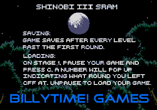 This patch is designed to add a simple saving mechanism to Shinobi III.Details and patching instructions can be found in the readme.