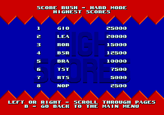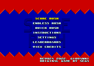 Sonic 1 - Score Rush is a modification of Sonic the Hedgehog.This ROM hack introduces three new gamemodes to the game, all focused around one central gimmick, that being the Score Rush.The Score Rush is a gameplay gimmick in which your score, which starts from 5000 points, constantly goes down at a steady pace. Should it go down to 0, the player immediately fails the challenge. Most standard methods of obtaining points still work, but you can also obtain points through rings, checkpoints, and powerups. Finishing levels awards you a fixed 1000 point bonus, with the score tallies being completely removed.The gamemodes featured within this ROM hack are the following:Score Rush: A full playthrough of Sonic 1 from start to finish, with the Score Rush gimmick. The objective is beating the game with the highest score possible. Running out of points leads to an immediate, full restart of the playthrough.Endless Rush: A playthrough of randomly selected Sonic 1 levels, increasing in difficulty as it goes on. The objective is beating the highest possible amount of levels in one sitting.Quick Rush: The gamemode allows the player to select one level of their liking, and playing said level under the usual Score Rush gimmick.Other changes include:A brand new main menu, from which all features of the game can be browsed;The option to have a modernized moveset, including moves such as the Spin Dash, the Super Peel-Out, and the Drop Dash;Leaderboards;Complete, automatic SRAM support.Not all of the people directly (or indirectly) involved with the development of Sonic 1 - Score Rush could be credited in the appropriate form. You can see the extended credits list from within the game’s “VIEW CREDITS” option.
