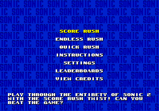 Sonic 2 - Score Rush is a ROM hack of Sonic the Hedgehog 2 for the SEGA Mega Drive/Genesis.This ROM hack is a direct sequel to the previously released Sonic 1 - Score Rush, and it brings all of its features to Sonic 2. This hack is also directly built on top of “Sonic 2 with Knuckles”.Much like its predecessor, this ROM hack introduces three game modes to the game, all focused around one central gimmick, that being the Score Rush. The Score Rush is a gameplay gimmick in which your score, which starts from 5000 points, constantly goes down at a steady pace. Should it go down to 0, the player immediately fails the challenge. Most standard methods of obtaining points still work, but you can also obtain points through rings, starposts, and certain powerups. Finishing levels awards you a fixed 1000 point bonus, with the score tallies being completely removed. Acquiring an invincibility monitor freezes the score, preventing it from running down. It may also freeze on certain instances where the player is not in control.This ROM hack can be played as Sonic, who sports as additional optional moves the following:the Drop Dash, from Sonic Mania;the Super Peel-Out, from Sonic CD;the Insta-Shield, from Sonic 3.In addition, this hack can also be played as Tails and Knuckles, both of whom feature their movesets from Sonic 3 & Knuckles.Furthermore, it is possible to enable bullet deflection, a feature from Sonic 3 & Knuckles that protects characters from bullets, so long as they are using their air moves.All of the above additions are optional, and it is possible to revert back to the original Sonic 2 moveset.Sonic 2 - Score Rush features the same three game modes from Sonic 1 - Score Rush, them being the following:Score Rush: A full playthrough of Sonic 2 from start to finish, with the Score Rush gimmick. The objective is beating the game with the highest score possible. Running out of points leads to an immediate Game Over.Endless Rush: A playthrough of randomly selected Sonic 2 levels, increasing in difficulty as it goes on. The objective is beating the highest possible amount of levels in one sitting.Quick Rush: The game mode allows the player to select one level of their liking, and playing said level under the usual Score Rush gimmick.Due to the sheer amount of people credited in the ROM hack for their contributions, the appropriate form could not be filled in. It is recommended that you make use of the “VIEW CREDITS” option provided in game.To play Sonic 2 - Score Rush, you must apply the provided xdelta patch on a REV01 ROM. If you bought the Steam release prior to its delisting, the ROM in question should work just fine.