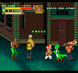 This is a player sprite hack of Streets of Rage 2 that replaces some characters for the characters from the Bootleg game called “Kart Fighter”.Characters edited:Max - ToadJack - MarioZamza - KoopaR.Bear - BowserShiva - PeachAbadede - Donkey Kong