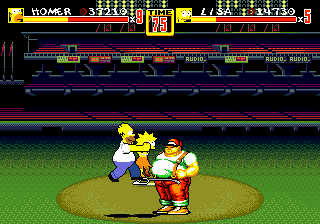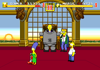 The Simpsons characters in Streets of Rage 2. Homer is Max, Marge is Axel, Lisa is Blaze, Bart is Skate, Smithers is Shiva and Mr. Burns is Mr. X.