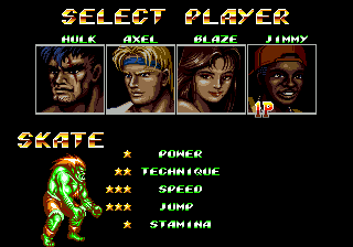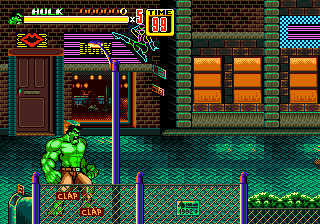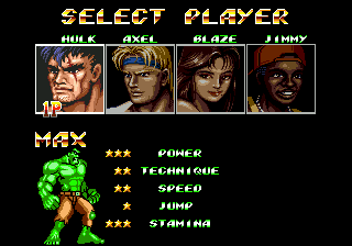 Play and defeat Streets of Rage 2 with the two green heroes! This Streets of Rage 2 ROM hack replaces Max with Hulk (Bruce Banner) and Skate with Blanka (Jimmy). The hack also modifies one of the color palettes. The blue color of one of the palettes was replaced with green to include Hulk and Blanka in the game.