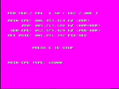 Shows effective CPU speed for Sega Genesis and for Sega CD, if attached.Usable for checking overclocking in emulators and hardware.Cpu speed affected by dram refresh cycles and other stuff [like 2 cpu access one area at once] and differs by areas where’s code executed. This areas can be changed by buttons. On real hardware it’s possible to execute code from the sega-cd registers area without ram refreshing effect to see real clock speed.This test shows: Main-cpu M68000 cycles per second, Z80, Sub-cpu 68000 if sega-cd is connected, and for gfx asic pixels per second approximately. Shows 68010 for modded with 68010 cpu consoles.Test counts for real cycles, but maybe not 100% accurate +- for several 10’s Hz. If you know the difference with the real frequency, you can try to send me a message.