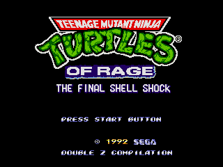 1-3-2021 UPDATE: The .zip file for this hack contains three .ips files: the Final Shell Shock patch being playable on all hardware and in all emulators, with each of the respective Re-Shelled patches allowing players a better sound experience when using the Terraonion MegaSD cartridge (for MD+ sound) or Mega Everdrive cartridge (for MSU-MD sound).Patch ONLY ONE of the .ips files to your original SoR2 rom, depending on what emulator/system you intend to use.Originally released on 5/24/2020, eskayelle’s ultimate vision comes to fruition with this final set of mods in the TMNT of Rage series.On an alternate timeline in an alternate universe, Mr. X and the Syndicate have fallen at the hands of those radical reptiles, the Teenage Mutant Ninja Turtles. Furious with his latest failure to control the city, X enlists one Oroku Saki to capture the fearsome foursome’s greatest ally, April O’Neil.Rage in their hearts and pizza in their bellies, the turtles jump into action, dead set on putting an end to Mr. X’s tyranny once and for all… and punish the Shredder for being complicit in the Syndicate’s nefarious misdeeds as well.A direct descendant of eskayelle’s TMNT of Rage hack and its TMNT Remix successor, this mod adds the following to the Teenage Mutant Ninja Turtles of Rage experience:A throwback to the old 90’s arcade splash screens starts off your gaming experience.A six sequence ending specific to this game, the first for any SoR2 hack out there, incorporates redesigned images from the classic TMNT II and III NES games. These images also put some artistic spins on the palettes / color schemes for a bit of extra fun.Those bumbling buffoons, those moronic mutants, Rocksteady and Bebop, have now joined the Syndicate! Dumber than advertised, but stronger than ever, get ready to go toe to toe with them, Bebop making his first appearance in a Genesis / Mega Drive game.An updated story in attract mode complements the new ending sequence.A new title screen takes greater advantage of the Genesis / Mega Drive’s palette options.Thanks to Yoni, gone are road apples in favor of a nice slice! Try not to smile the first time you hear Mikey calling out “Pizza Time!” as he grabs some grub.With the additional Re-Shelled MD+ patch, play the game on a Terraonion MegaSD (or with any emulator that supports MD+ functionality) to enjoy that sweet soundtrack from eskayelle’s TMNT MD+ Remix. Grab that soundtrack here!When using the MSU-MD Re-Shelled patch, play the game on a Mega Everdrive cart (or with any emulator that supports MSU-MD functionality) with this extended soundtrack.With the 12-23-2020 (v1.999.1) update, Raph now has a fully working charge move, and both Raph and Mike can now register hits after confiscating any enemy weapon.And… those fantastic features from the previous mods in the series continue to kick shell:Regardless of your region, the same tubular Final Shell Shock / Re-Shelled title screen and story intro will display.SNES Turtles in Time portraits provide your starring cast on the player select screen.Name sprite tiles on the player select screen call out Mike, Leo, Don, and Raph.Are you used to Leo being the most well-rounded turtle? Raph being the strong one? Each reptile remains rebalanced!Tired of getting your head stomped in by your “buddy”? Ti’s friendly fire patch has been applied, limiting the damage players can do to one another in story mode to throwing enemies and weapons.Duplicate turtles in duel mode have alternate palettes, putting them that much closer to their ‘80s cartoon counterparts.Galsia/Garcia and Donovan finally get their due! Play far enough into the game, and on the right difficulty setting, and you’ll have to contend with each of them once as a mini-boss.Thanks to savok, now all players can run in all directions, as well as start a run when turning around. With the added speed, how many more air/juggle combos can you create with your favorite turtle?Shiva’s on a leave of absence given his multiple failures to protect Mr. X. Backing X up this time is… the Shredder!Continues remain removed to balance the lives options and allow for greater difficulty. Choose your turtle, and your lives count, wisely; you’ve only got one shot to take down the big man with the cigar.SCD’s restorations from the original SoR2 remain: Garcia, Garuda, and Mosquito names; enemy knockouts counter; plus Mr. X’s cigar and cigar animation.Check the in-game credits and the readme for so many folks whose assets, code, tutorials, or specific guidance helped make this game happen! Cowabunga! Booyakasha! … Reaganomics!