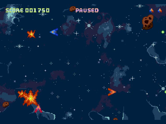 itch comments : a simple shooter for the mega drive/genesis, but with a unique mechanic: control two spaceships (blue and orange) that they move antiparallelly, for example, pressing up on the d-pad will move the blue ship up, while the orange one moves down. , destroy the asteroids and enemy ships to score points! if one of the ships hits an asteroid/enemy, both ships destroy and lose 1 life (they are shared between the two)., this game has PCM music, rather than FM synth, which is the most noticeable reason why it has 2mb rom size., controls:, D-pad to move the ships., A, B or C buttons to shoot, START to pause (restart game if it's game over)