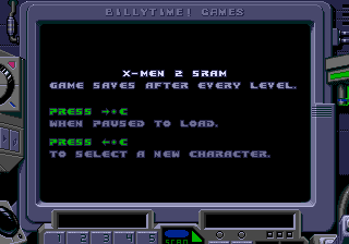 This patch is designed to add a simple saving mechanism to X-Men 2 - Clone Wars.How it works:Saving:Game saves after Siberia and every level onward after selecting a character.Loading:Press C+- when the game is paused.Character Select:+C when the game is paused.NOTE:Game will produce a black screen if no prior save is detected.Details and patching instructions can be found in the readme.